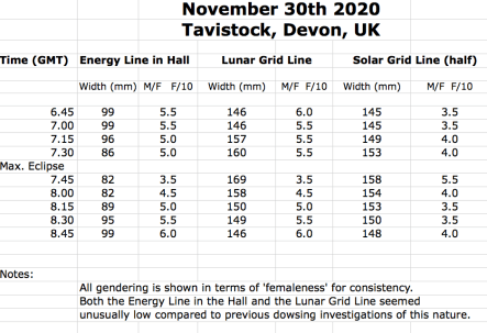 Any dowser, even the quite inexperienced, could do this type of work at any eclipse. It doesn’t even have to be anywhere near you. A solar or a lunar eclipse is simply the direct alignment of the sun, earth and moon in various combinations. A visual total solar eclipse is certainly a bucket list item for anyone with any sense of awe for the natural environment, but at that type of event you are so overwhelmed, both physically and emotionally, during the few minutes of celestial activity that any serious dowsing is something of a side issue to the immersive experience. Dowsing the slightest of lunar eclipses in your own hall, early on a foggy Devon morning in November, does have its advantages.